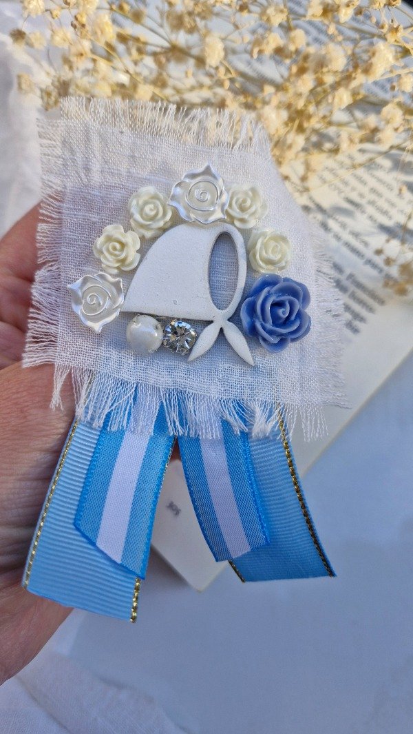 Prendedor patrio, bandera argentina y pin del pañuelo blanco, símbolo internacional de derechos humanos y de lucha popular.