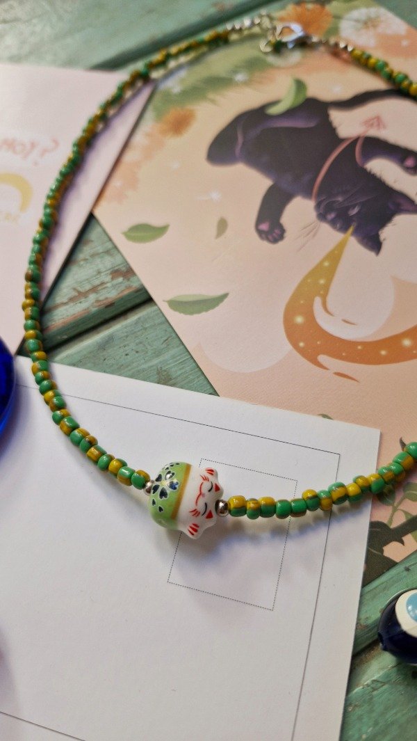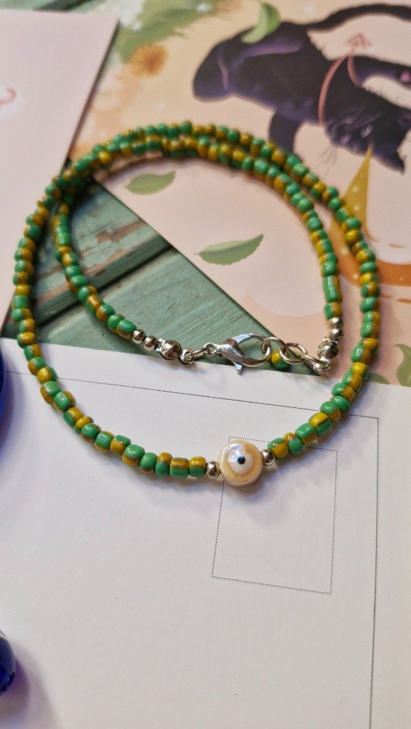 Collar de mostacillones de bicolores con dijes amuletos - ojo turcos y gatos protectores - (40cm de largo de extremo a extremo)