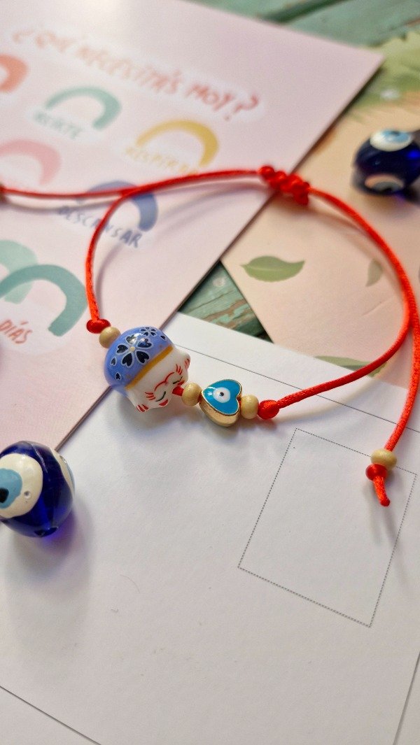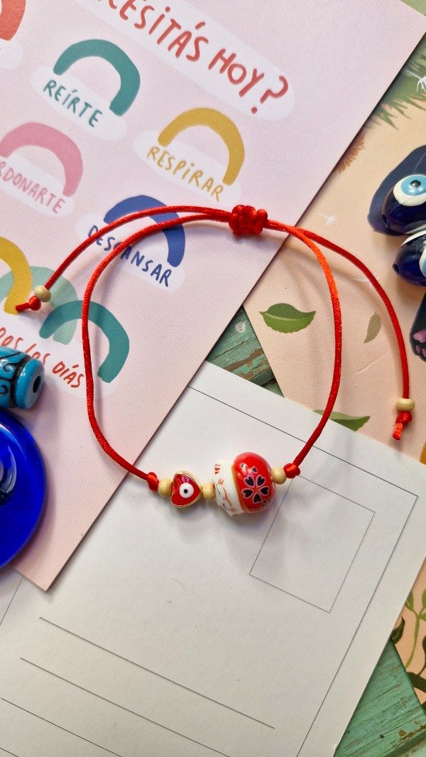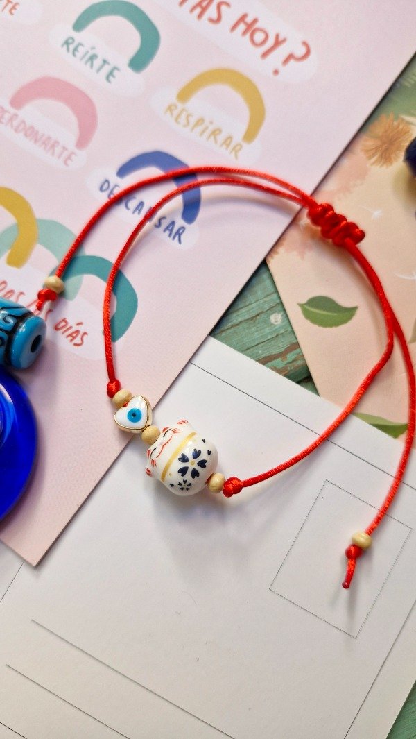 Pulsera de hilo chino rojo protector con dije de metal ojo turco para proteger contra la envidia, las malas energías y el mal de ojo y dije de ceramica de gatito amuleto de la suerte que trae buena fortuna 💰 a su dueño.