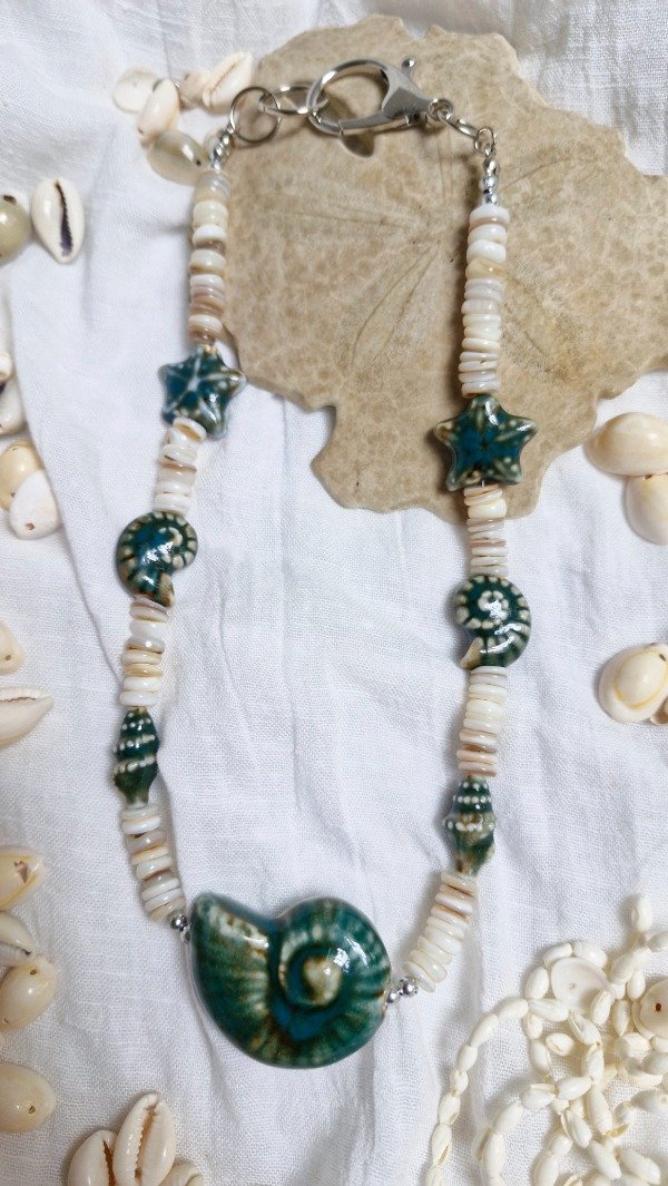 Collar corto para usar solo o combinado con otros collares. Realizado en nácar y cerámicas, ideal para un look de veranito. Abierto de punta a punta mide 45 cm aprox.