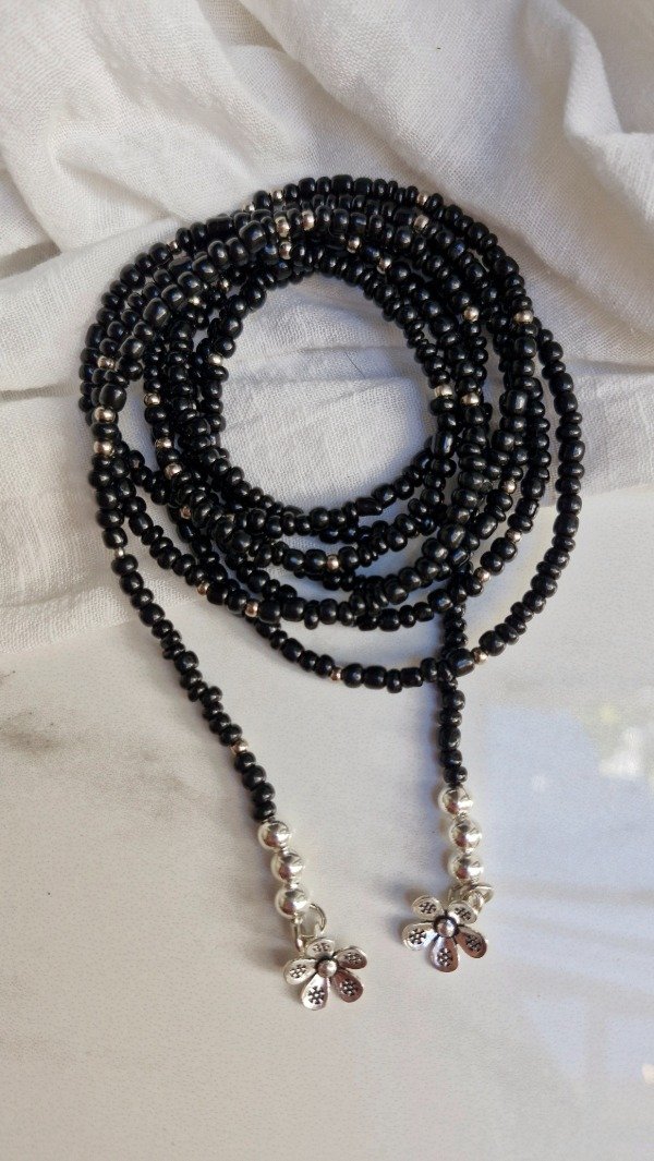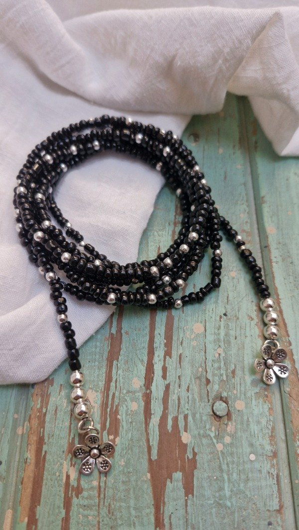 Collar para usar como desees, enroscado en el cuello o bien logrando un efecto cascada de 190 cm de largo aproximadamente. Es ideal para combinar con otros collares.