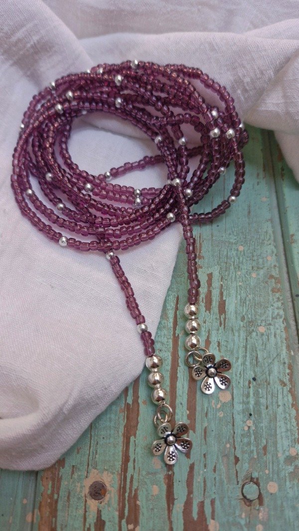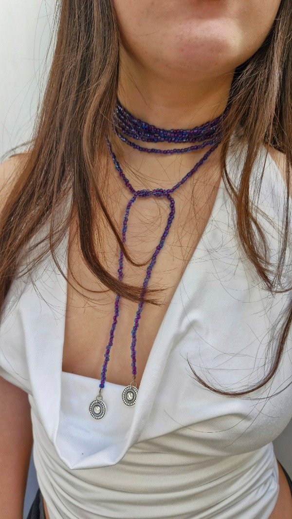Collar para usar como desees, enroscado en el cuello o bien logrando un efecto cascada de 190 cm de largo aproximadamente. Es ideal para combinar con otros collares.