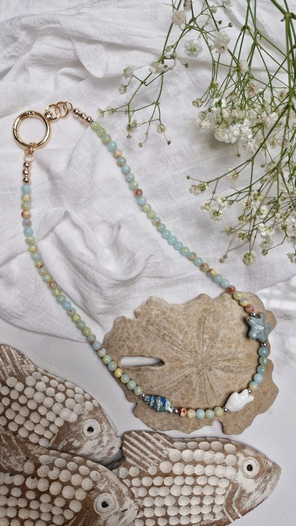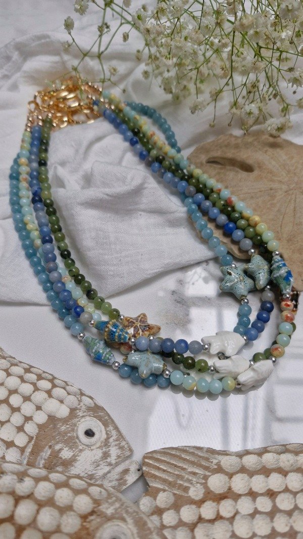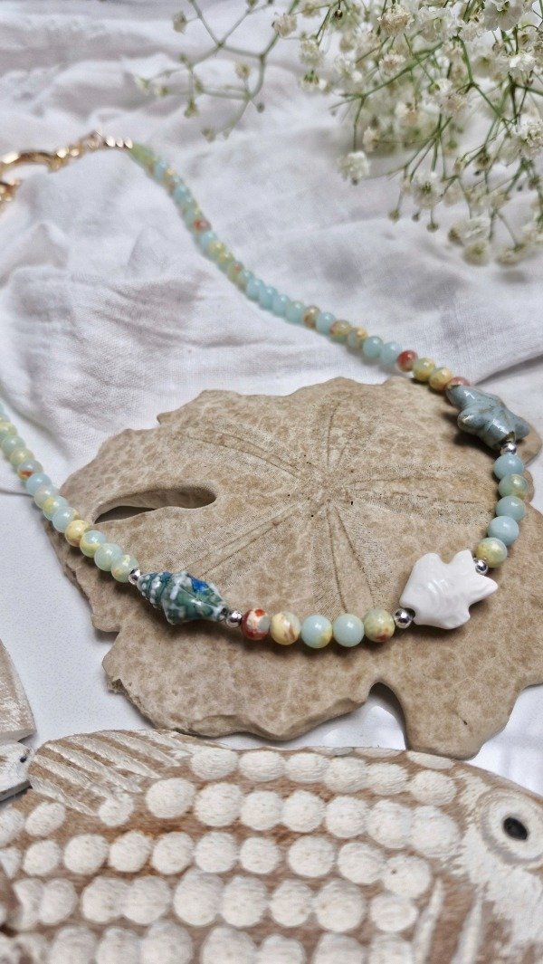 Collar para usar solo o combinado con otros collares. Realizado en piedras y cerámicas, ideal para un look de veranito. Abierto de punta a punta mide 60 cm aprox.