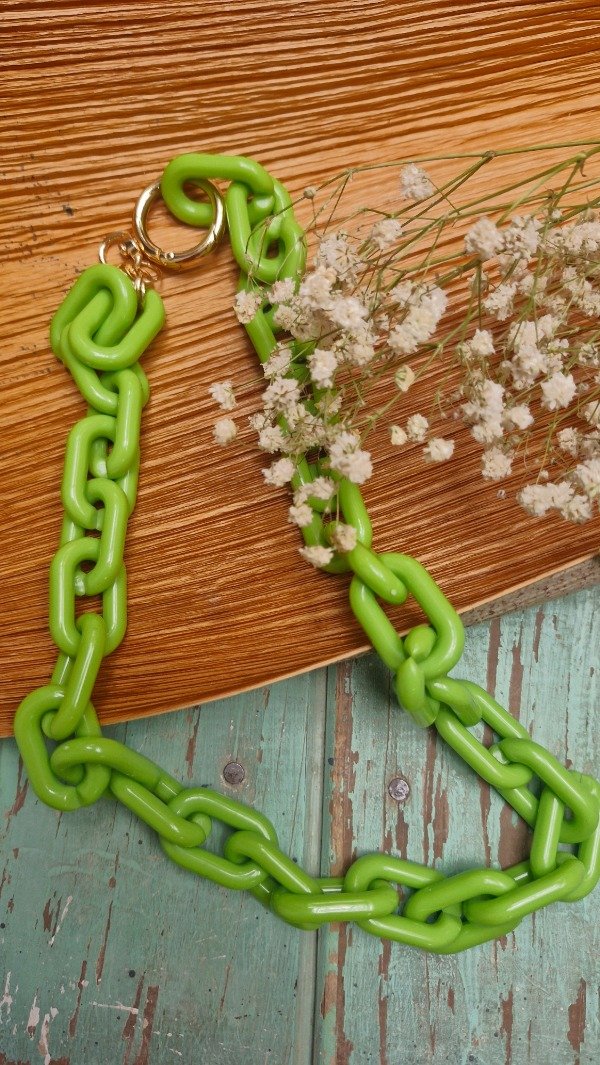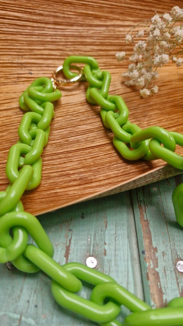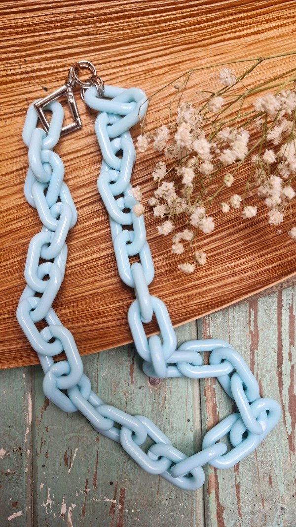 Collar de cadenas de acrílico con mosquetón en metal, ideal para usar combinado con un collar corto. Abierto de punta a punta mide 65 cm aproximadamente.