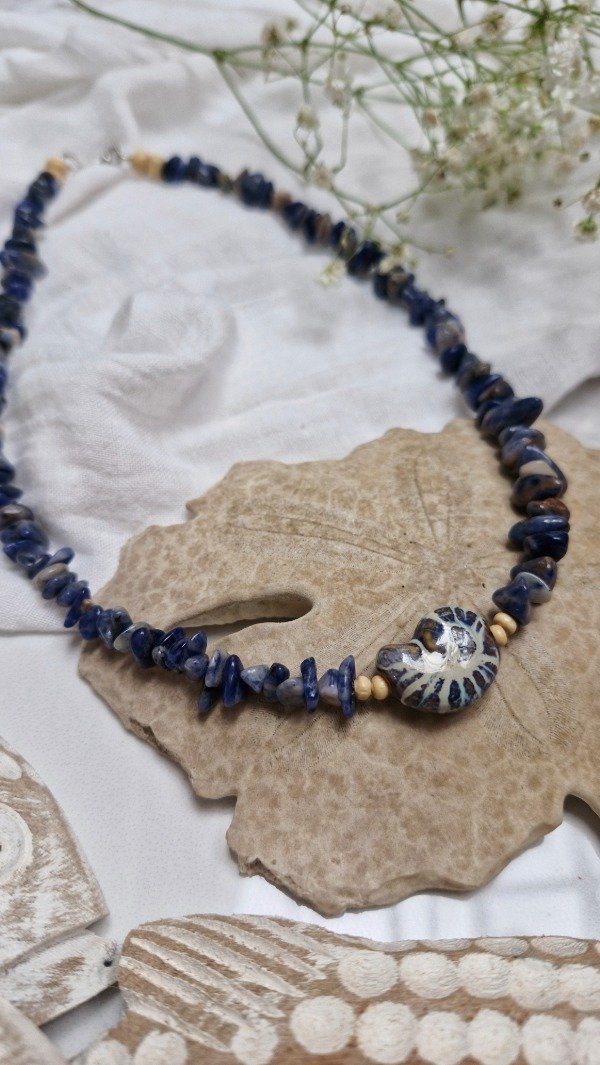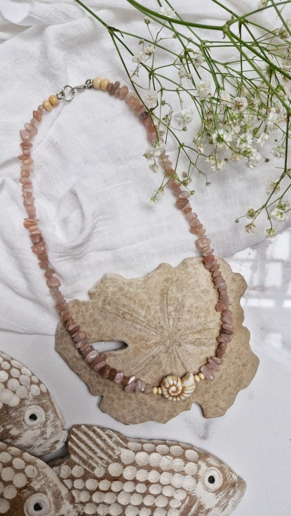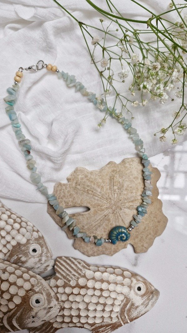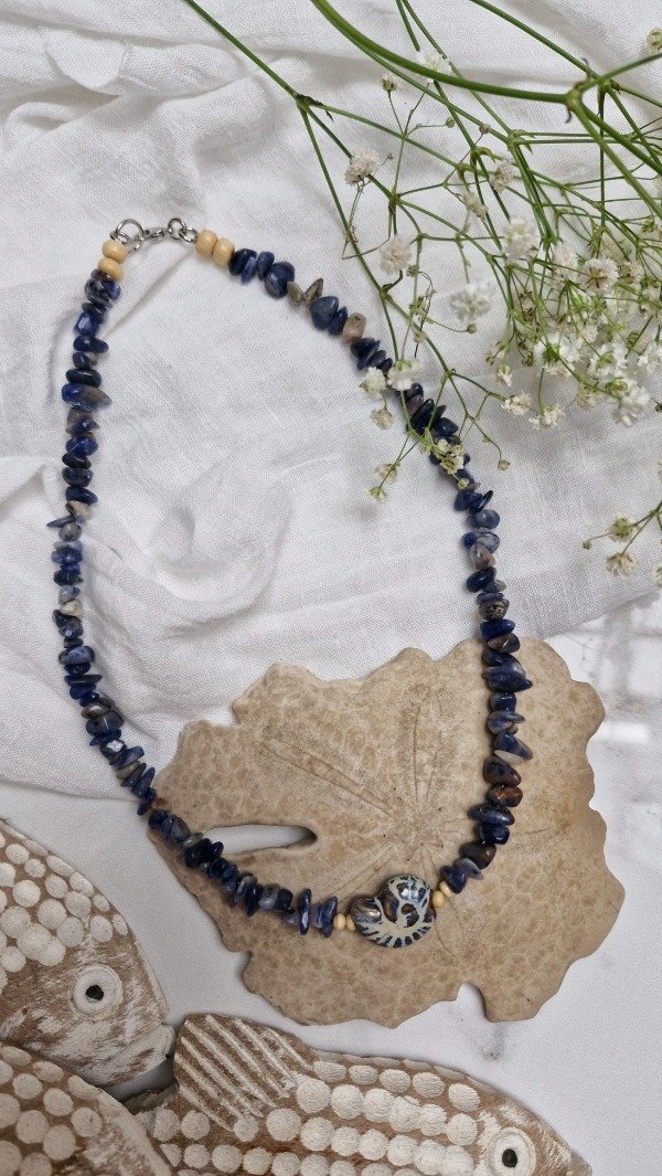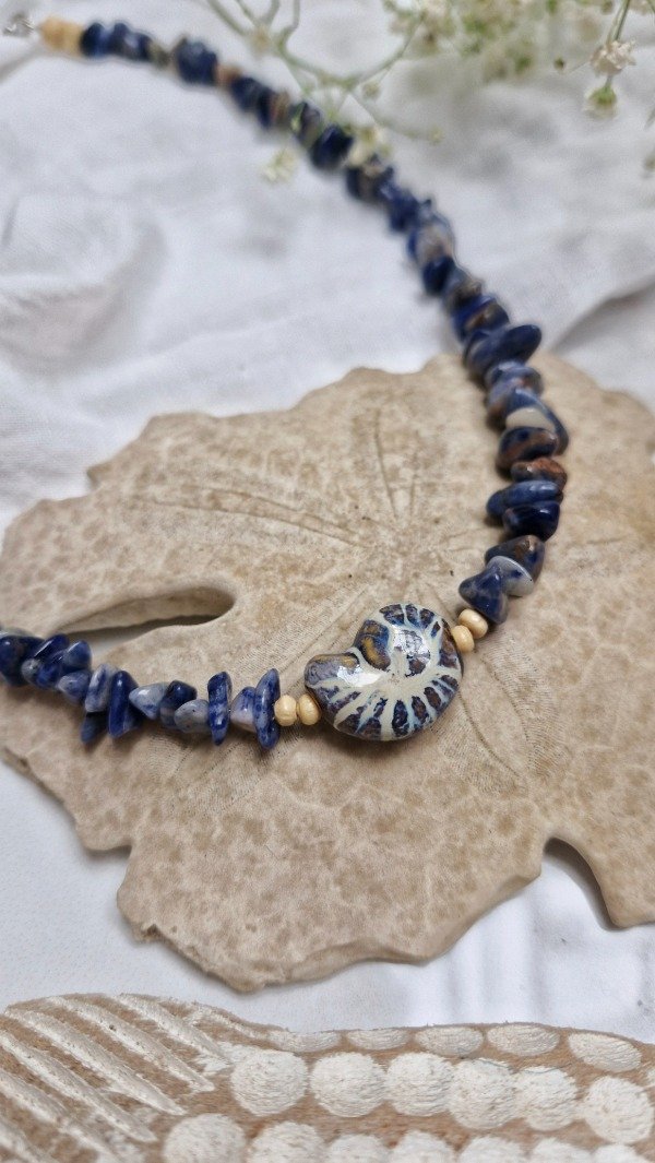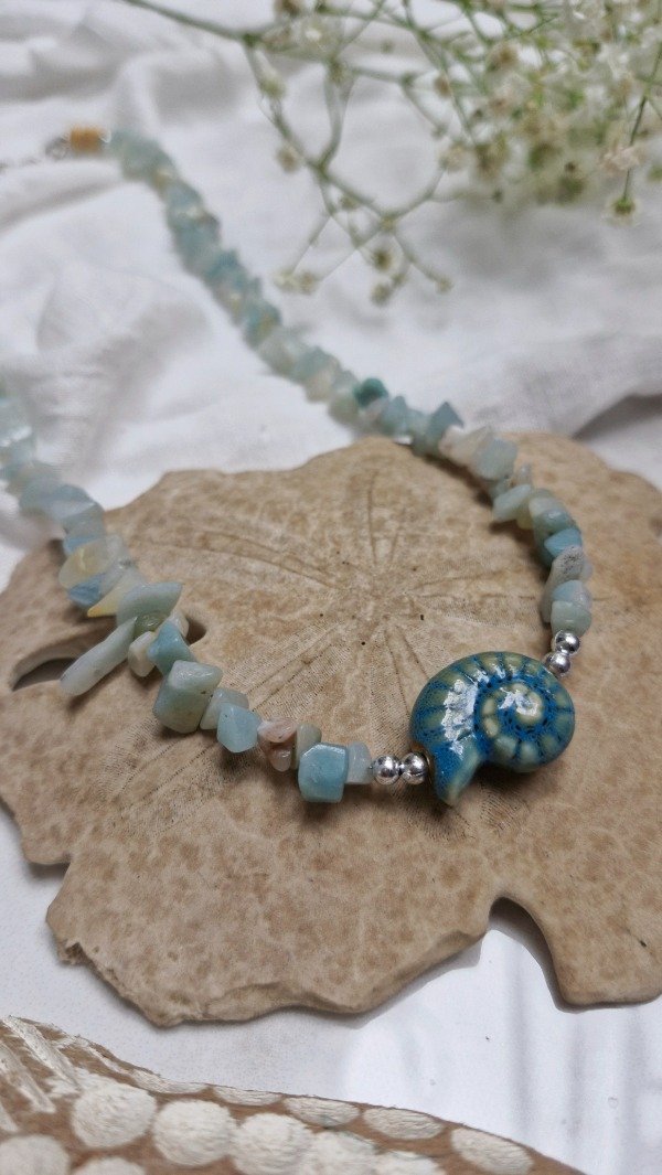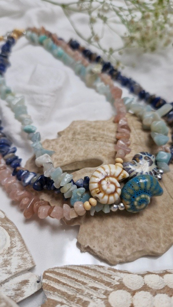 Chocker corto para usar solo o combinado con otros collares. Realizado en piedras con dije de ceramica ideal para un look de veranito. Abierto de punta a punta mide 52 cm aprox.