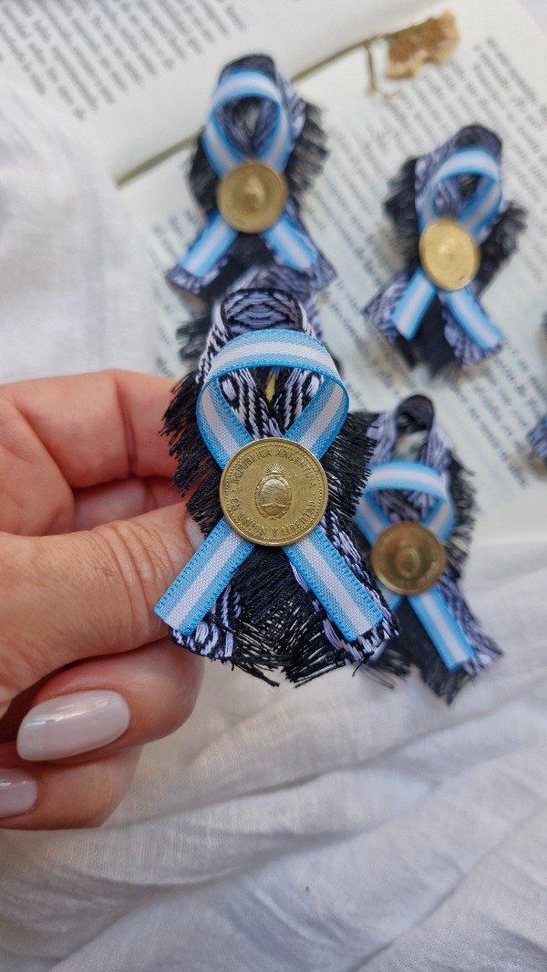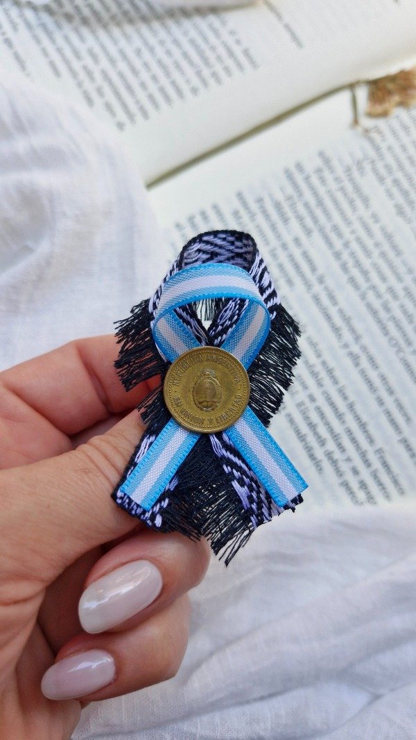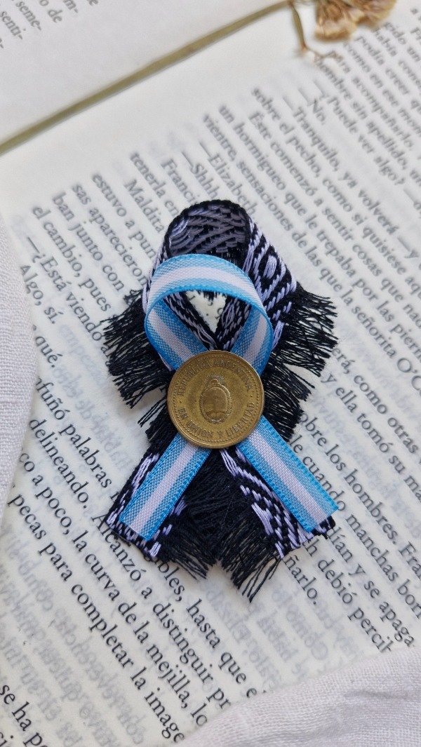 Prendedor patrio bordado a mano con moneda argentina. Lleva el nombre de una mujer que formo parte de la historia de nuestro país, para recordar lo importante que fue. Cada diseño es único e irrepetible.