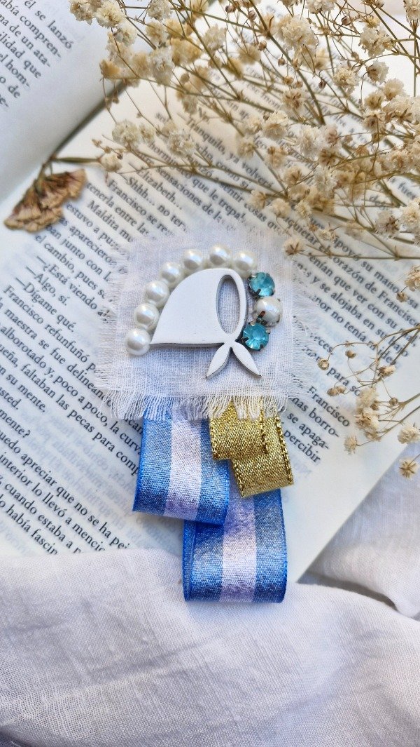 Prendedor patrio, bandera argentina y pin del pañuelo blanco, símbolo internacional de derechos humanos y de lucha popular.