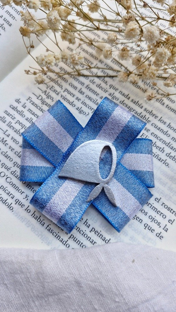 Prendedor patrio, bandera argentina y pin del pañuelo blanco, símbolo internacional de derechos humanos y de lucha popular.