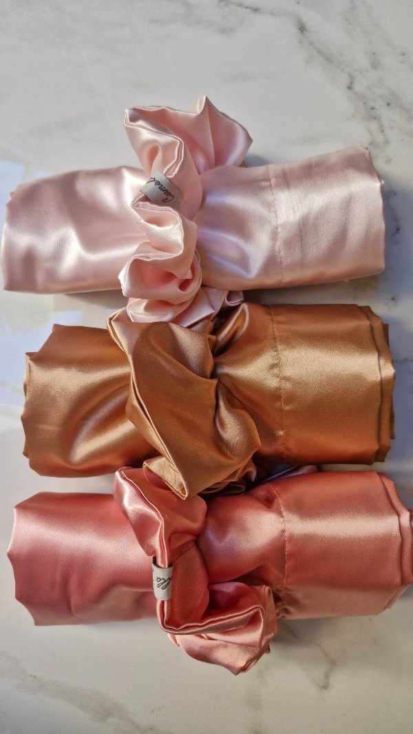 Funda para almohada de 70 x 46 cm aproximadamente y scrunchie, ambas de satén elastizado perfumado. Ideal para cuidar tu pelo y la piel de tu cara evitando la friccion y asi lograr menos frizz y una piel mas luminosa.