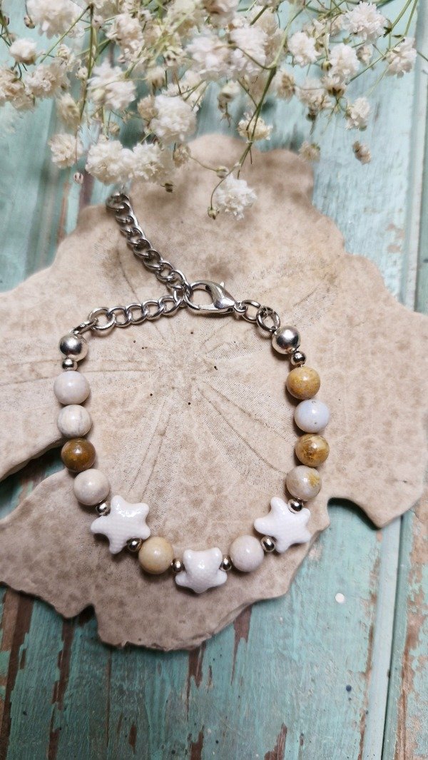 Pulsera de piedra y ceramicas.Cuando termines la compra avisanos de que medida es tu muñeca o tobillo asi la ajustamos a tu medida! Tenes que saber que no se puede mojar, pero va a dejar tu look de veranito increible.