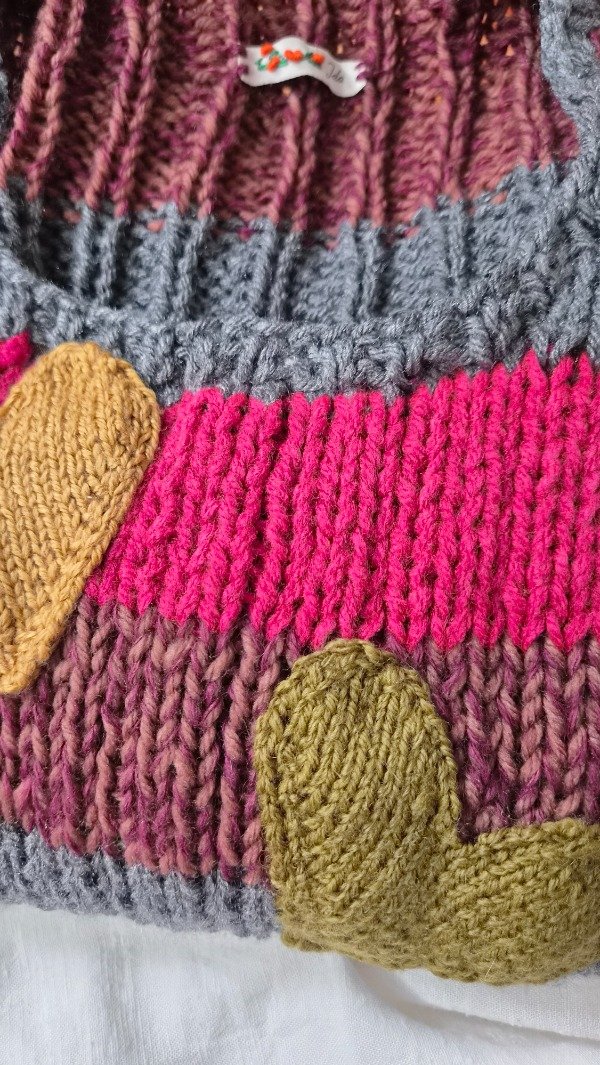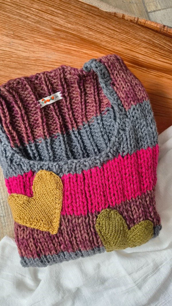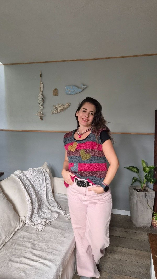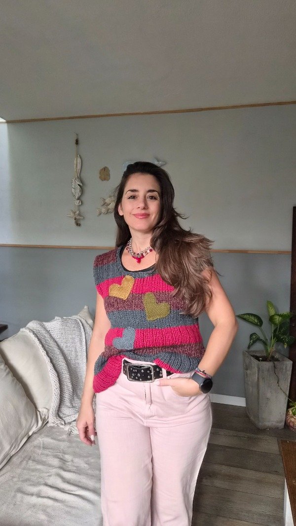 Chaleco tejido a mano a 2 agujas en lana sintetica. Super cómodo, suave y flexible.