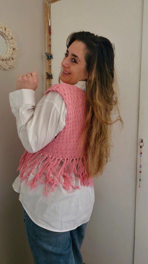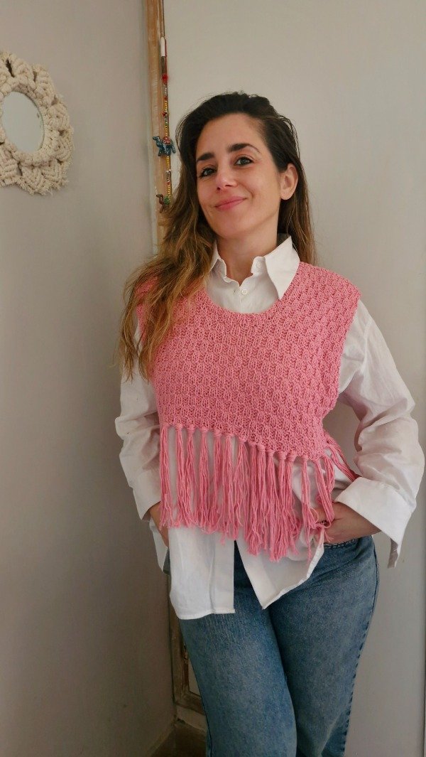 Chaleco tejido a mano a 2 agujas en hilo de algodón. Super cómodo, suave y flexible. Sisas super abiertas.
