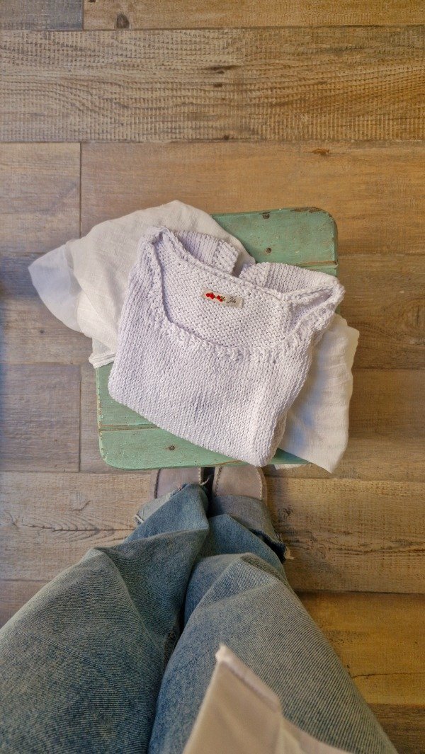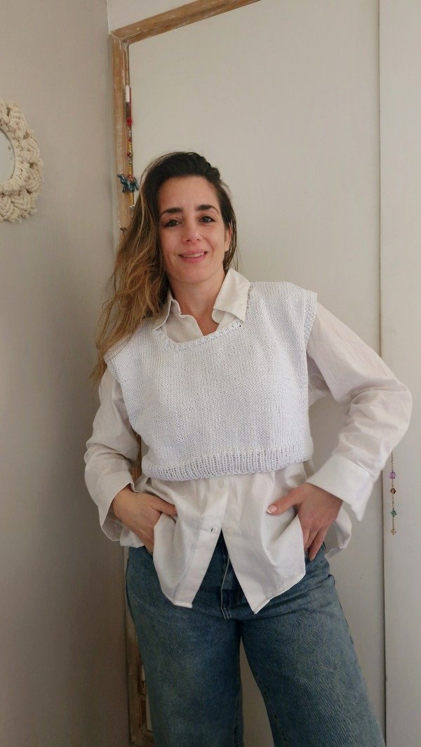 Chaleco tejido a mano a 2 agujas en hilo de algodón. Super cómodo, suave y flexible. Sisas super abiertas.